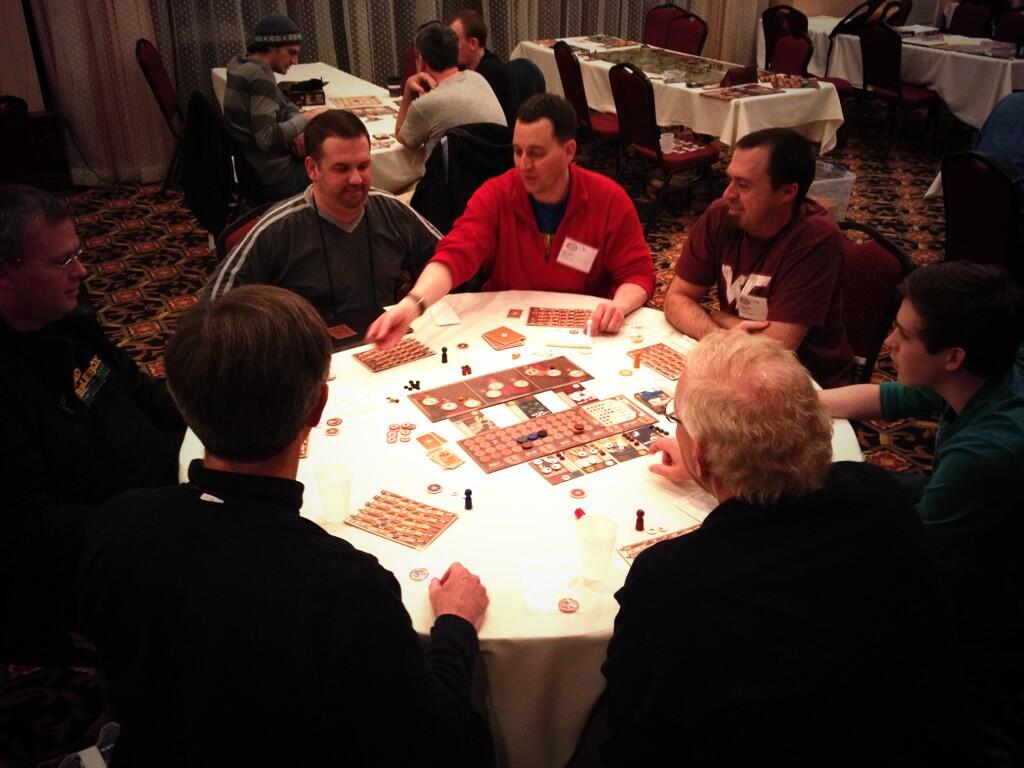 The tournament I was most excited to participate in was my favorite game, Chicago Express (designer Harry Wu, artist Michael Menzel, publisher Queen Games). I played against Lee Sensabaugh (the GM), Mike Senzig (who was in the final with me last year), and another player whose name escapes me. I was fortunate to win in the Thursday afternoon heat with a decent total of $71. It would turn out to be the only game I won in competition of the entire convention.